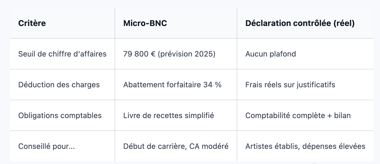 La fiscalité artistique possède ses propres règles, souvent méconnues des cabinets généralistes. Deux régimes principaux coexistent : micro-BNC et déclaration contrôlée. Sous le micro-BNC, l’administration applique un abattement automatique de 34 % sur les recettes jusqu’à un plafond réévalué chaque année (79 800 € estimés pour 2025 selon la fiche officielle Service-public ). Au-delà, ou sur option, l’artiste bascule vers le réel avec déduction des frais véritables, ce qui nécessite une comptabilité complète.